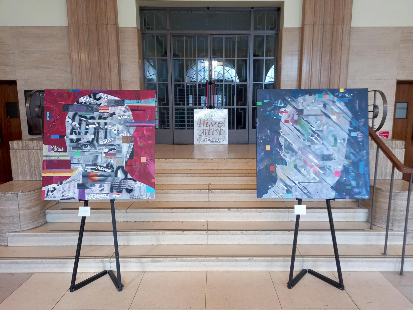 Continuing the environmental theme of the previous year’s exhibition, I chose to turn inward, focusing on the individual psyche and how it is shaped by social media in the digital age. Returning to my portraiture roots, I combined realistic fragments of Elon Musk and Mark Zuckerberg with abstraction, creating distorted, layered compositions that reflect the chaotic and polarising nature of online platforms.
