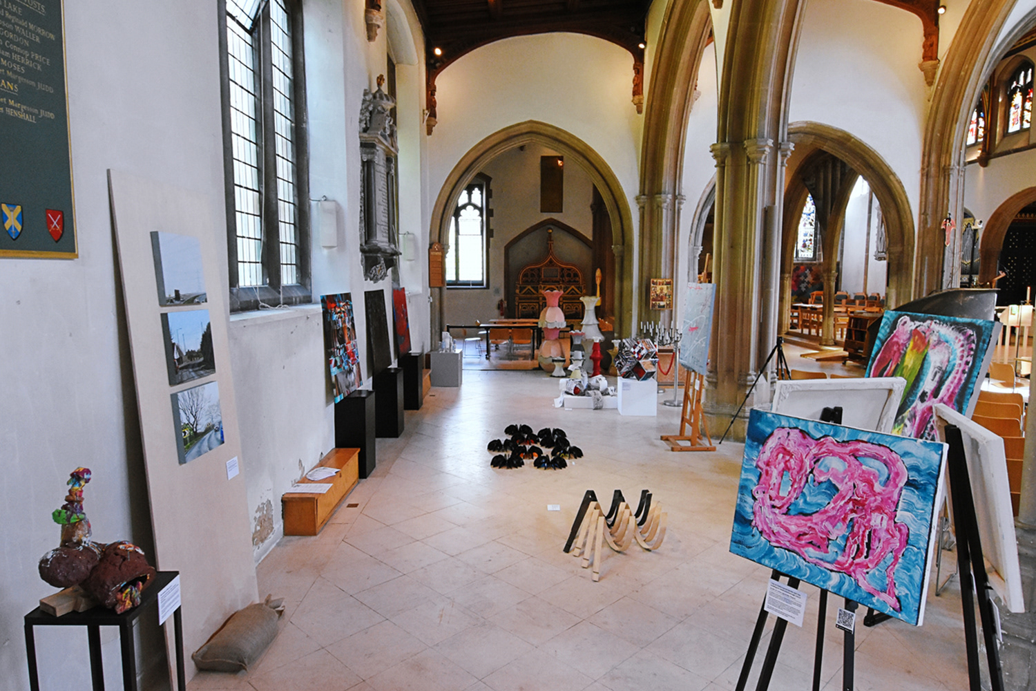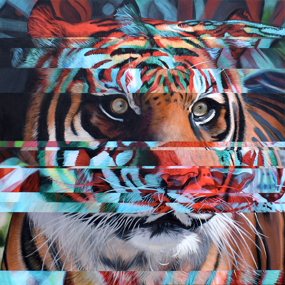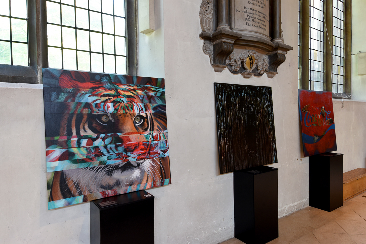 This exhibition focused on the climate crisis as part of the Chelmsford Green City event. I chose to depict three endangered species, each rendered realistically before being distorted or destroyed in a different way: a tiger glitched to the edge of recognisability, a sea turtle entwined in a corporate logo, and a polar bear obscured beneath thick black paint representing oil. I filmed the painting and destruction of each work, presenting them alongside QR codes linking to the respective videos, so that the installation took on an element of performance.